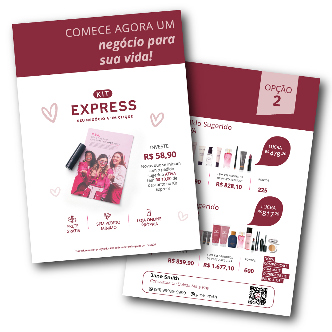 Apresente a oportunidade Mary Kay com mais profissionalismo utilizando o Folheto Oportunidade MK. Especialmente para Consultoras e Diretoras de Beleza da Mary Kay, este material destaca as opções de Kits de Início (Kit Express), facilitando a abordagem e aumentando suas chances de recrutamento.