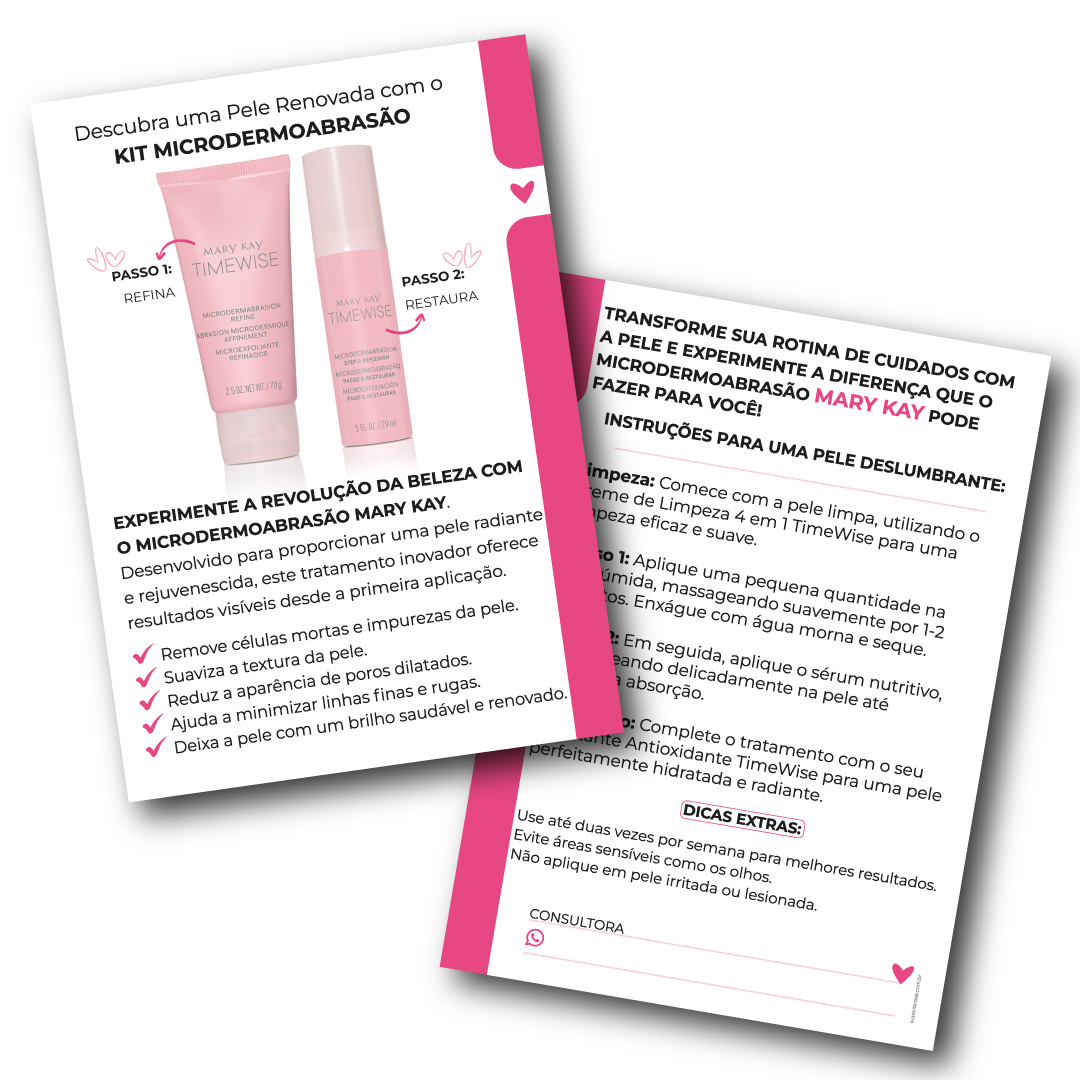 Garanta que suas clientes aproveitem ao máximo os benefícios do Kit Microdermoabrasão Mary Kay TimeWise com este folheto claro e visualmente atraente. Um recurso indispensável para quem busca excelência no atendimento e deseja fidelizar suas clientes.