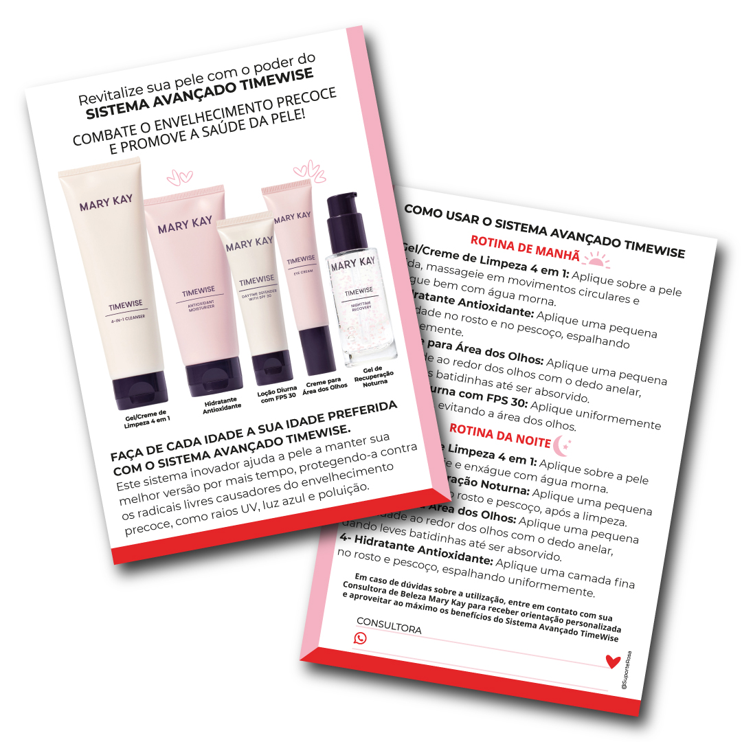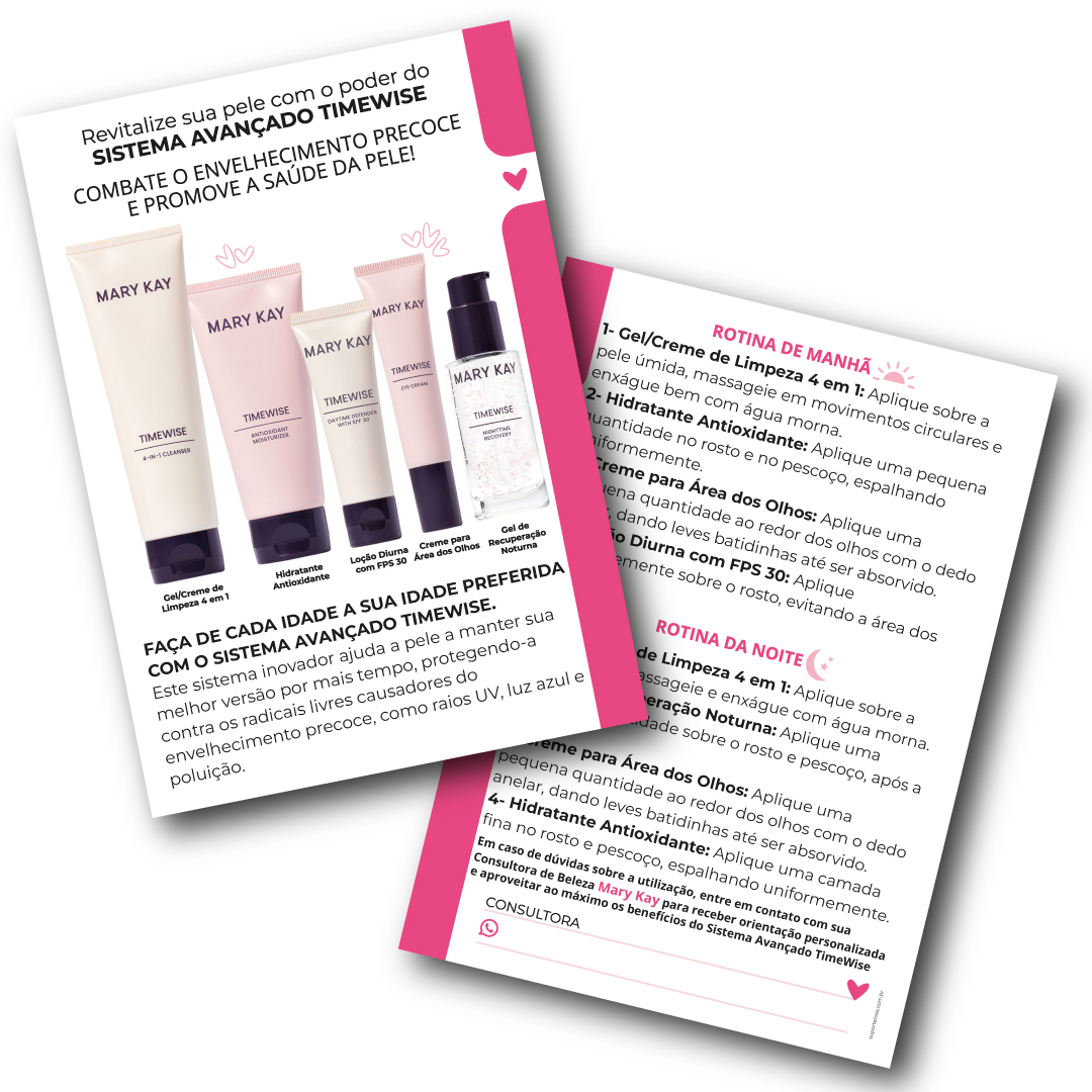 O Folheto TimeWise Mary Kay é a ferramenta ideal para Consultoras que desejam entregar não apenas um produto, mas também conhecimento e cuidado. Com uma apresentação clara e objetiva, ele explica os benefícios e o modo de uso do Sistema Avançado TimeWise, ajudando suas clientes a aproveitarem ao máximo seus produtos.